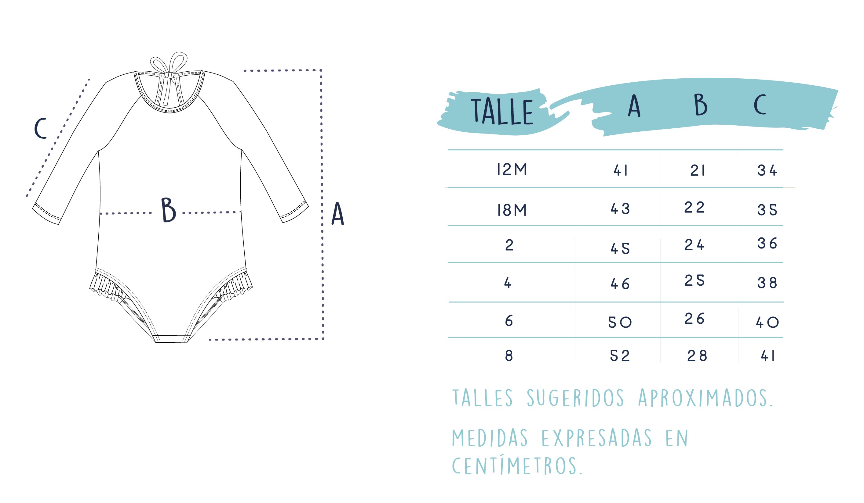 IMPORTANTE: Te recomendamos que para elegir el talle tomes en cuenta las medidas de la tabla que se encuentra a continuación y no las edades de referencia, ya que la edad es a nivel general y depende mucho de la contextura de la nena. Podés medir un traje de baño que tengas y le quede bien y compararlo con nuestras medidas.