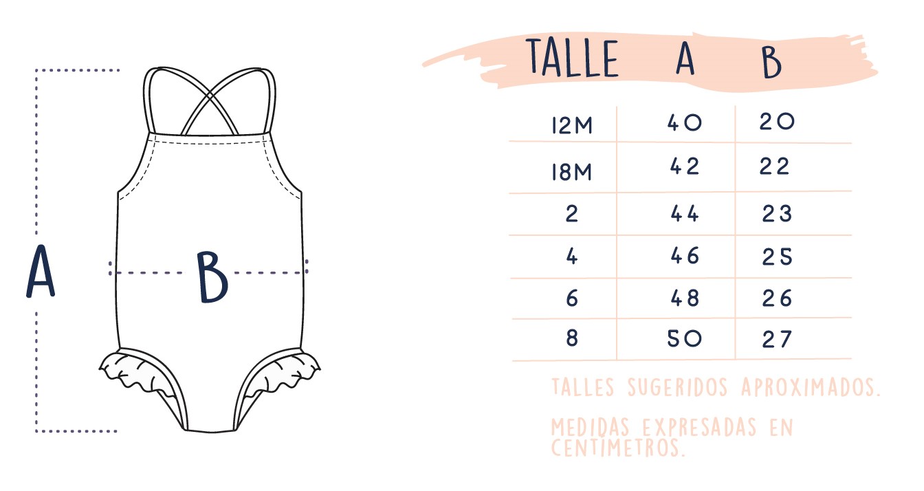 IMPORTANTE: Te recomendamos que para elegir el talle tomes en cuenta las medidas de la tabla que se encuentra a continuación y no las edades de referencia, ya que la edad es a nivel general y depende mucho de la contextura de la nena. Podés medir un traje de baño que tengas y le quede bien y compararlo con nuestras medidas.